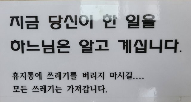 칠곡 가실성당 주차장 화장실에 쓰여져있는 문구, 삶은 쓰레기 배출의 연속이다. 자신이 버린 쓰레기는 마땅히 책임져야하는게 옳다.