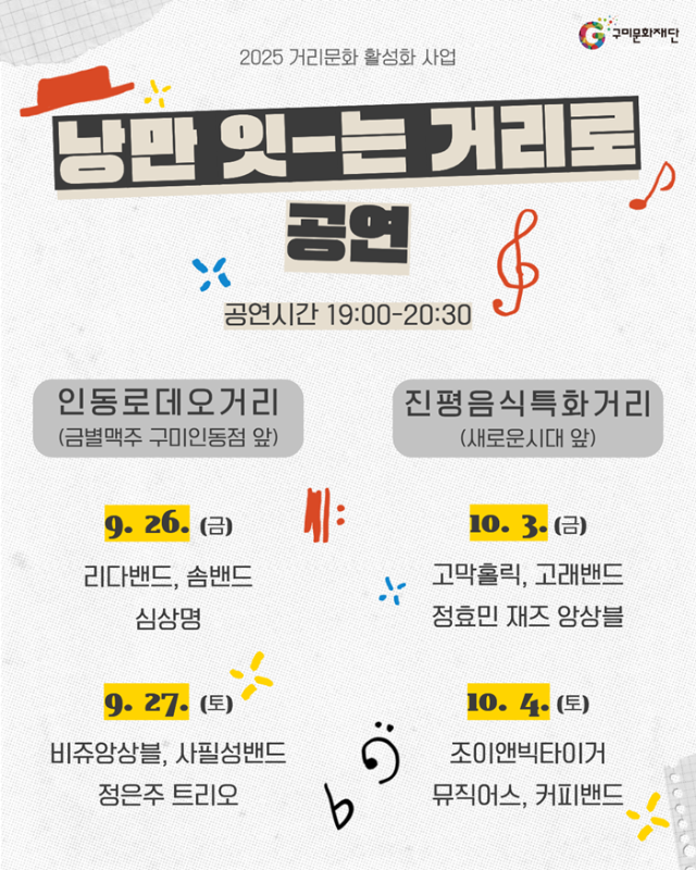 #구미문화재단 #추석연휴공연 #가을맞이공연 #거리활성화공연 #인동로데오거리 #진평음식특화거리 #금오산배꼽마당 #야외공연 #재즈공연 #거리문화활성화 #구미공연 #구미문화예술 #귀성객문화행사 #도심공연문화 #시민문화향유 #지역예술인교류 #구미가볼만한곳 #구미추석행사 #구미가을공연 #문화예술행사