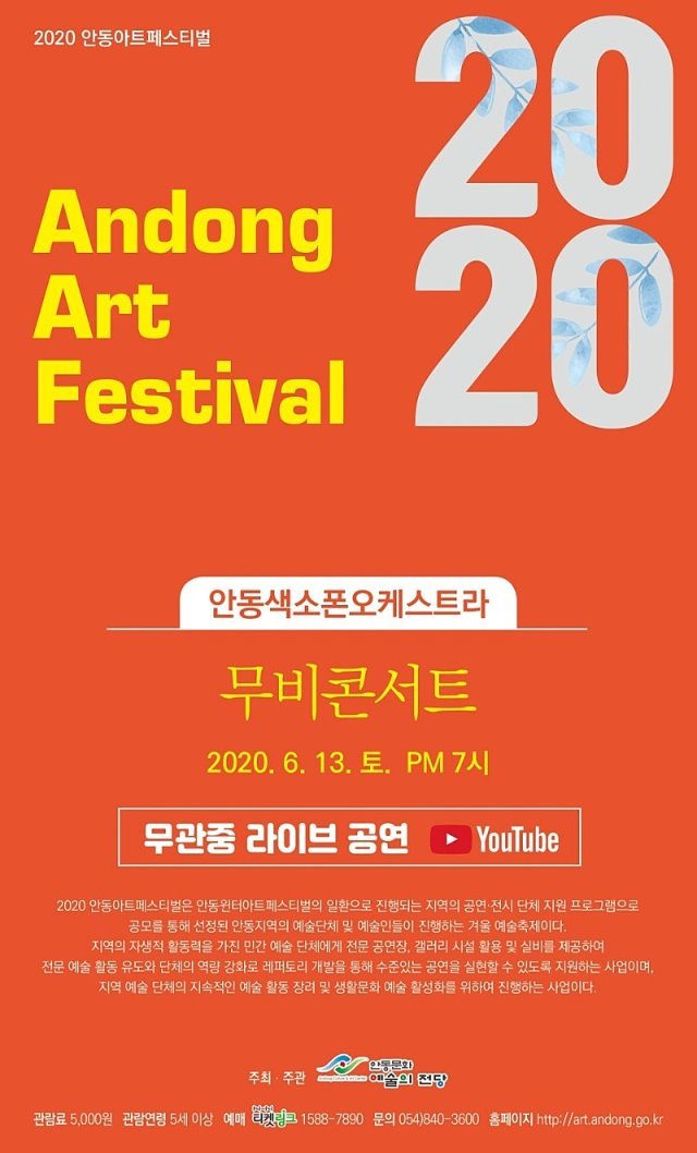 2020 안동아트페스티벌‘안동색소폰오케스트라의 무비콘서트’의 자세한 내용은 안동문화예술의전당 홈페이지(http://art.andong.go.kr)를 참고하거나, 전화(☎054-840-3600)로 문의하면 된다.