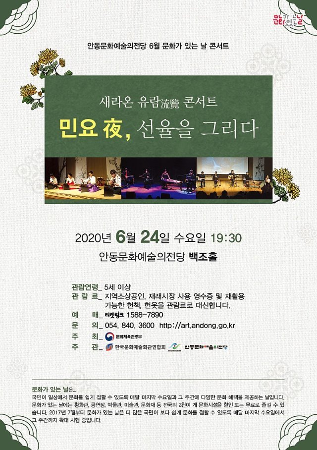 (전국= KTN) 김도형 기자= 안동문화예술의전당은 오는 24일 저녁 7시 30분 백조홀에서 문화가 있는 날 콘서트 ‘새라온 유람(流覽)콘서트 민요 夜, 선율을 그리다’를 진행한다.