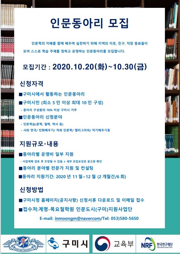 인문동아리 활동 망설이지 마세요! 구미시 2020 인문도시지원사업 인문동아리 모집