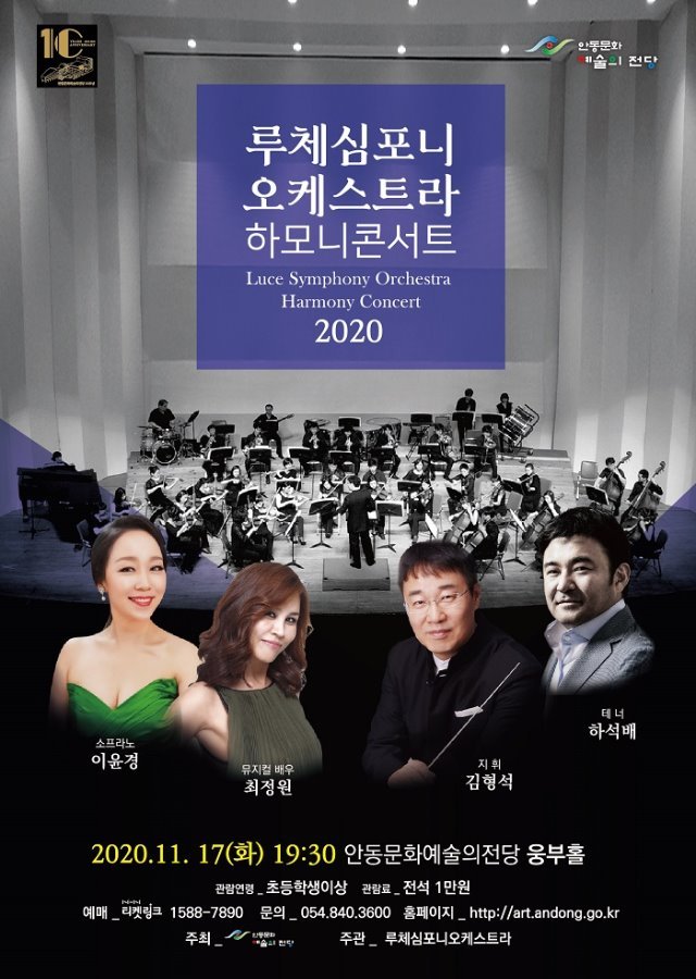 안동문화예술의전당 기획공연‘루체심포니오케스트라의 하모니 콘서트’는 초등학생 이상 관람 가능하며 관람료는 전석 1만 원이다. 코로나19로 인한 지역민의 안전을 위해 관람 입장 전 체온 측정 및 마스크 착용 확인, 개인위생 관리를 철저히 할 예정이다. 자세한 내용은 전화(☎840-3600) 또는 안동문화예술의전당 홈페이지(Http://art.andong.go.kr)로 확인할 수 있다.