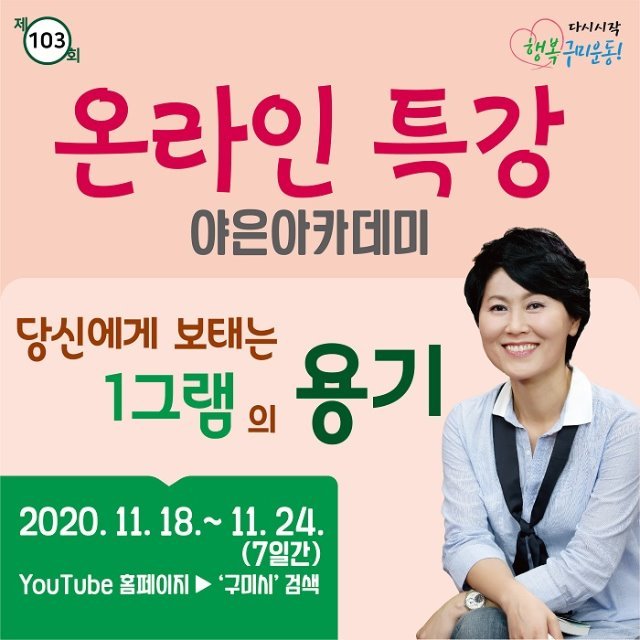 (전국= KTN) 김도형 기자= 구미시평생교육원(원장 주광하)에서는 11월18일~11월24일(7일간) 국제구호전문가 한비야의 『당신에게 보태는 1그램의 용기』를 주제로 야은아카데미 특강을 개최한다.