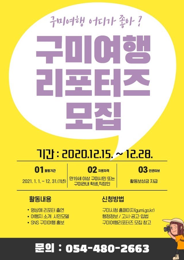 지원자격은 만 19세 이상으로, 여행을 좋아하고 사진과 동영상에 출연이 가능한 구미시민과 관내 대학생, 직장인은 누구나 가능하다. 선발된 리포터들은 2021년 1월 1일부터 1년간 다양한 구미여행홍보 콘텐츠제작에 참여하게 된다.