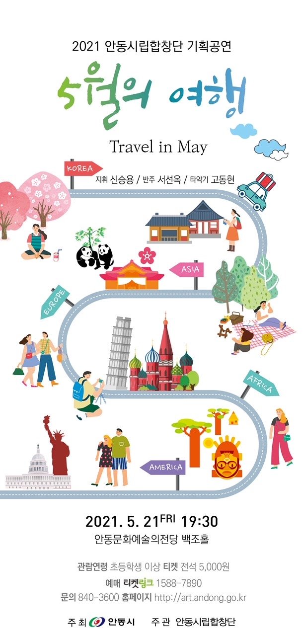 ‘안동시립합창단 기획공연 – 5월의 여행’전반부는 르네상스의 마드리갈 중 Morley의 ‘Now is the Month of Maying’과 이 작품을 모티브로 만든 현대합창곡‘The Slow Spring’작품으로 밝은 희망을 전하며 후반부에는 한국, 아시아, 유럽, 아프리카 대륙의 합창곡들로 음악을 통해 세계로 떠나는 여행의 희열을 느낄 수 있도록 진행한다.