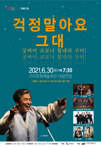 방역지침에 따라 좌석 띄어앉기로 운영하며, 공연문의는 구미문화예술회관 공연기획계(054-480-4565)로 하면 된다.