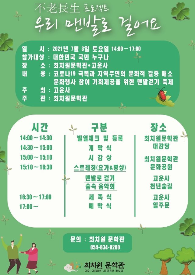 (전국= KTN) 김도형 기자= 의성군 최치원문학관은 오는 7월 3일‘不老長生(불로장생) 프로젝트-우리 맨발로 걸어요’행사를 개최한다고 밝혔다.