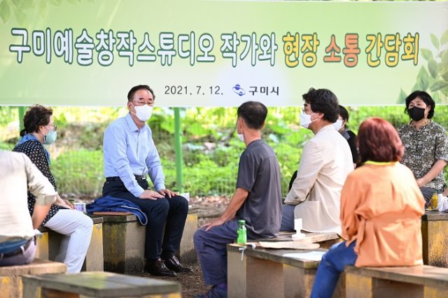 (전국= KTN) 김도형 기자= 구미시(시장 : 장세용)는 구미예술창작스튜디오(촌장 : 하훈)를 방문하여 7. 12(월) 14시 30분부터 예술창작스튜디오 야외 벤치에서 입촌작가 9명이 참석한 가운데 입촌 작가들과 현장 소통 간담회를 가졌다.