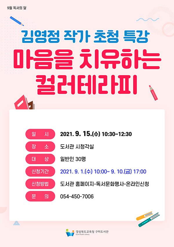 (전국= KTN) 김도형 기자= 경상북도교육청 구미도서관(관장 배경규)은 9월 독서의 달을 맞이하여 오는 15일 ‘마음을 치유하는 컬러테라피’를 주제로 김영정 작가 초청특강을 운영한다.