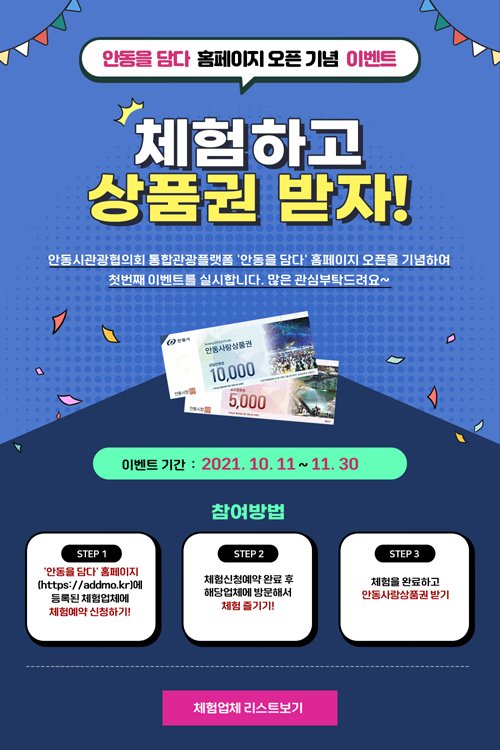 지난 10월 11일부터 11월 30일까지 홈페이지(https://addmo.kr)에 등록된 체험업체에서 예약을 신청하고 체험한 관광객에게 안동사랑 상품권 1만원권을 지급한다.