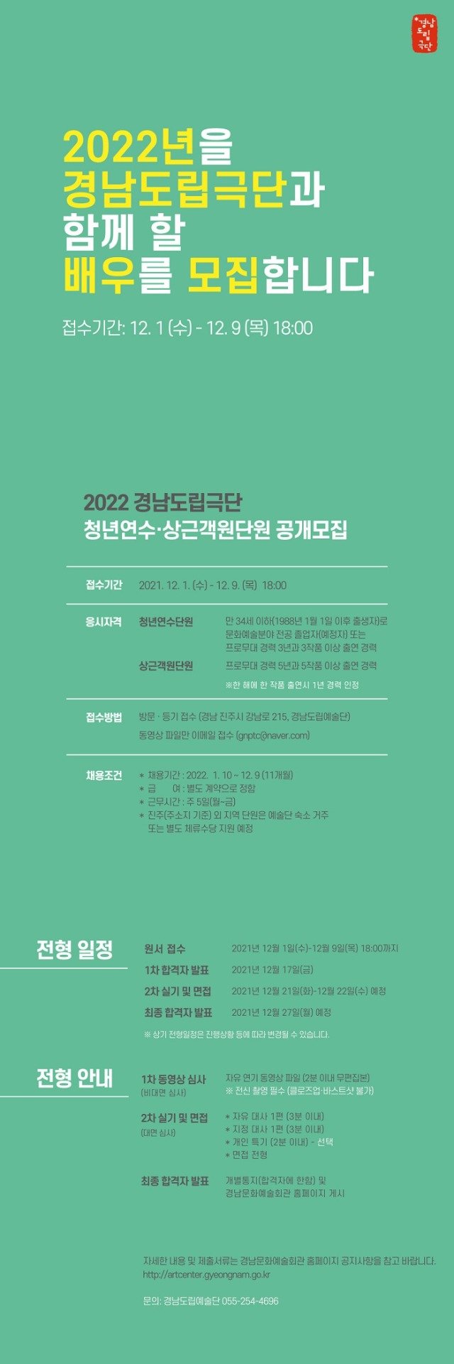 (부산,경남= KTN) 유승희 기자= 경남도립극단이 2022년 함께 할 청년연수단원 및 상근객원단원을 공개모집한다.