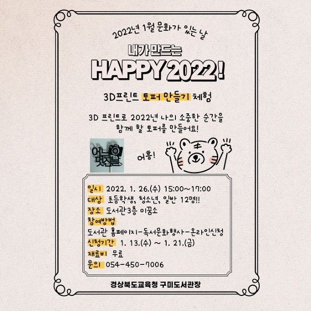 1월 문화가 있는 날(26일)에는 3D프린트 토퍼 만들기 체험으로‘내가 만드는 HAPPY 2022!’를 운영한다. 초등학생 이상 누구나 참여할 수 있으며 1. 13.(목) ~ 1. 21.(금)까지 도서관 홈페이지에서 선착순으로 모집한다.