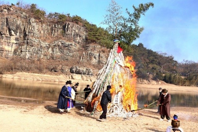 (전국= KTN) 김도형 기자= 임인년 첫 정월대보름을 맞아 2월15일 오전 6시 하회마을 화산 중턱의 서낭당, 국신당, 삼신당 일원에서 동제가 열렸다. 이날, 9시 부용대 앞 강변에서는 소수의 마을 주민만이 참여하여 소원지 달집태우기 행사도 열렸다.