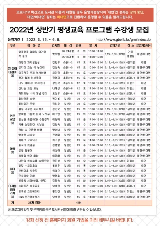 구미도서관, 2022년 상반기 평생교육 프로그램 수강생 모집