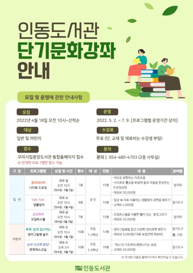 (전국= KTN) 김도형 기자= 구미시립중앙도서관(관장 이선임)에서는 4월 18일부터 4월 28일까지 인동도서관에서 운영하는 단기 문화강좌 수강생을 모집한다.