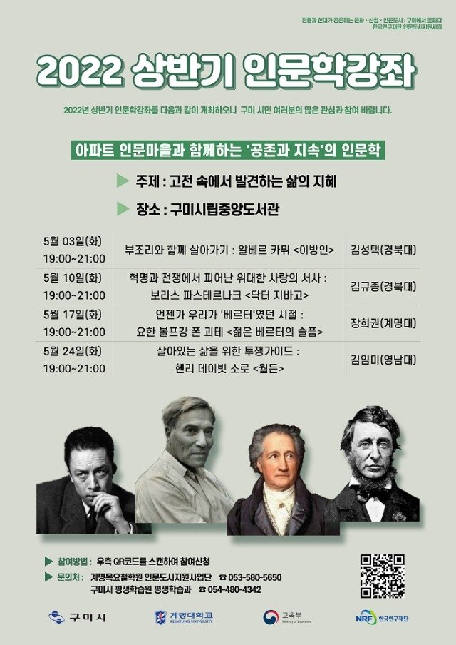 한편, 구미시는 계명대학교 목요철학원(원장 백승균)과 함께 인문학적 소통과 공감을 통한 사람 중심의 인문도시 구미를 만들기 위해 인문학 강좌, 인문체험, 인문행사 등 다양한 프로그램을 진행하고 있다.