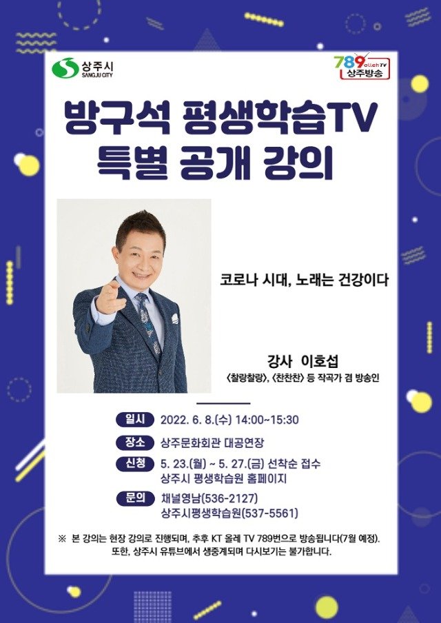 (전국= KTN) 김도형 기자= 상주시는 6월 8일 오후 2시 상주문화회관에서 이호섭(작곡가) 강사를 초청하여 방구석 평생학습 TV 특별 공개강의를 개최한다.
