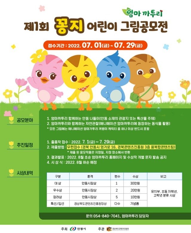 제1회 ‘꽁지’ 그림그리기 공모전은 8월 공정한 심사를 통해 8월 중순 수상작을 발표할 예정이며, 유치부·초등저학년·고학년 3개부로 나눠 안동시장상과 경북콘텐츠진흥원상 등 주요부문 각8개씩 24개 작품 그 외 특·입선 작품들을 선발 및 시상 할 예정이다.
