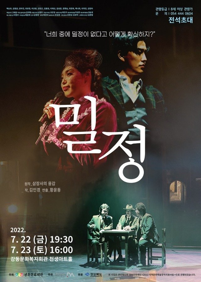 (전국= KTN) 김도형 기자= (사)문화창작집단 공터다 (대표:황윤동)에서는 오는 7월22일(오후7시30분)과 23일(오후4시)양일에 걸쳐 강동문화복지회관 천생아트홀(구미시 인동가산로 392)에서 연극 <밀정>을 무대에 올린다. 이번 공연은 경북문화재단에서 주최하고 경상북도가 후원하는 2022 지역문화예술창작지원사업의 일환으로 진행된다.