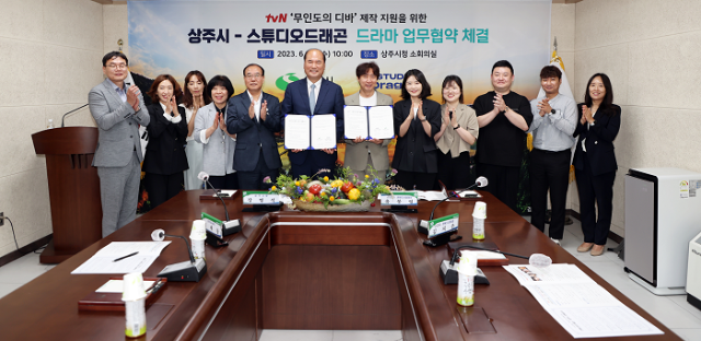 (전국= KTN) 김도형 기자= 상주시와 스튜디오드래곤은 6월 14일(수) 오전 10시 상주시청 소회의실에서 tvN‘무인도의 디바’드라마 제작 지원에 관한 업무협약을 체결했다.