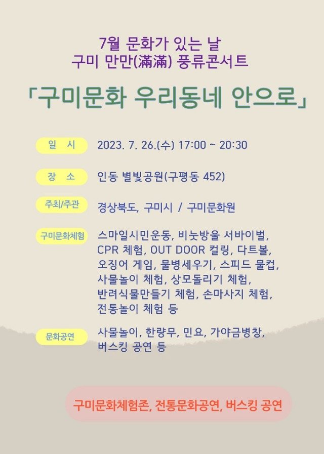 (전국= KTN) 김도형 기자= 구미시는 26일 별빛공원(구평동 소재)에서 구미문화원(원장 라태훈) 주관으로 7월 문화가 있는 날 「구미 만만(滿滿) 풍류 콘서트 - 구미문화 우리 동네 안으로」를 개최한다.
