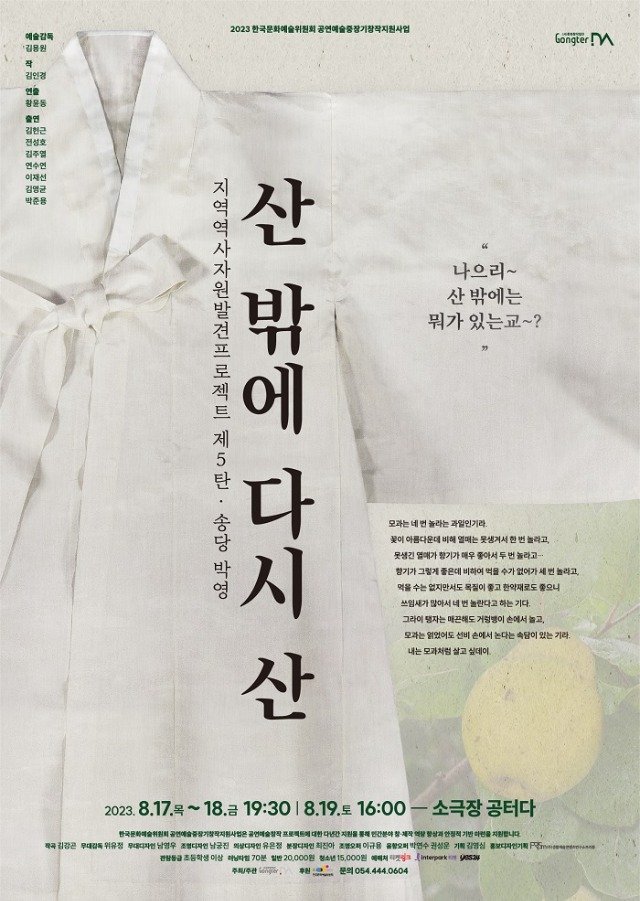 오는 8월17일부터 19일까지 소극장 공터다(구미시 금오시장로 4, 지하)에서 구미의 역사인물 송당 “박영”의 삶을 소재로 한 연극 <산 밖에 다시 산>을 발표한다. 공터다는 지역역사자원발견 프로젝트를 통해 지역의 연사인물을 소재로 한 공연을 꾸준히 제작하고 레파토리화 하는 것으로 전국적으로 그 가치를 인정받고 있다. 현재까지 <왕산 허위(의병장 허위)> <그 남자의 자서전/삼장사의 용감(독립투사 박희광)> <더 뮤즈 록주(명창 박록주)> <아도가 남쪽으로 온 까닭은(아도화상과 모례장자)>을 제작하였다.