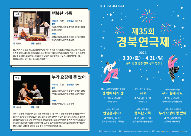 각기 다른 개성을 담고 있는 6개 작품의 경연이 펼쳐지는 제35회 경북연극제에 경북도민 여러분의 많은 관심을 기대한다. 본 행사에 대한 자세한 문의는 054-444-0604 로 하면 된다.