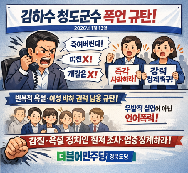 [한국유통신문= 김도형 기자] 더불어민주당 경북도당은 2026년 1월 13일 국민의힘 김하수 청도군수의 요양원 관계자 폭언 사건을 규탄하는 논평을 발표하며 즉각 사과를 촉구했다. 논평은 군수의 반복적 욕설과 여성비하를 공권력 남용으로 규정하고 국민의힘 차원의 징계를 요구했다.