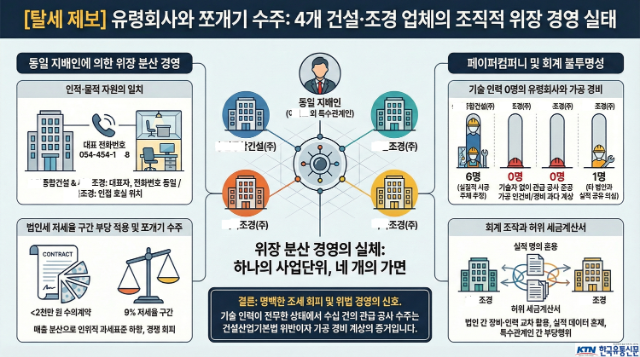 [한국유통신문= 김도형 기자] 경북 구미시 일대에서 외형상 별개 법인으로 위장한 채 실질적으로는 하나의 ‘가족형 사업단위’로 운영되는 건설사들이 포착됐다. 본지 취재 결과, 이들은 법인격을 남용하여 국가 조세 행정을 기망하고 공정 입찰 시스템을 교란하는 등 지능적인 탈루 행위 의심 여부가 관찰되고 있다. 복잡하게 설계된 이들의 ‘법망 피하기’ 실체를 데이터로 분석했다.