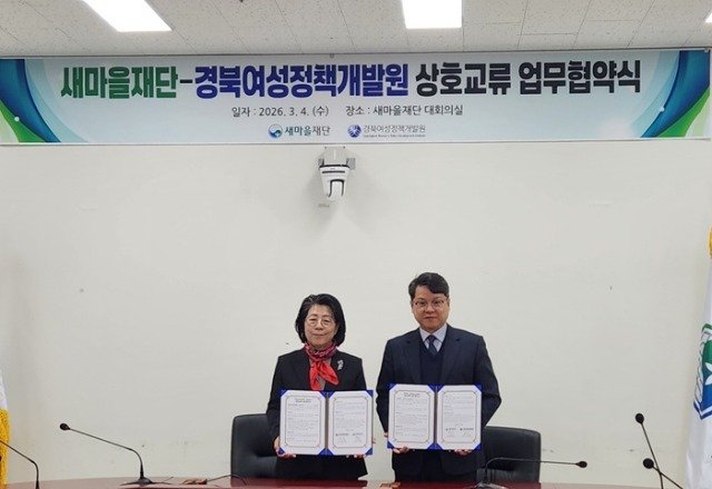 [한국유통신문= 김도형 기자] 새마을재단(대표이사 이영석)과 경북여성정책개발원(원장 하금숙)은 3월 4일 새마을재단 대회의실에서 업무협약(MOU)을 체결하고, 국내외 새마을사업과 국제개발협력 분야에서의 상호 협력을 강화하기로 했다.