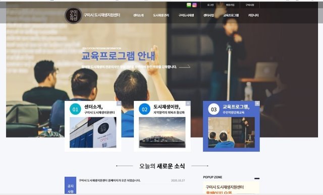도시재생지원센터 홈페이지는 크게 ▲센터소개 ▲도시재생관리 ▲구미도시재생 ▲센터사업 ▲교육프로그램 ▲커뮤니티 등 6개 분야로 구성됐으며, 반응형으로 제작하여 사용자의 화면 크기에 맞춰 조절되며, 컴퓨터, 태블릿, 스마트폰 환경에서 이용에 불편함이 없도록 했다.