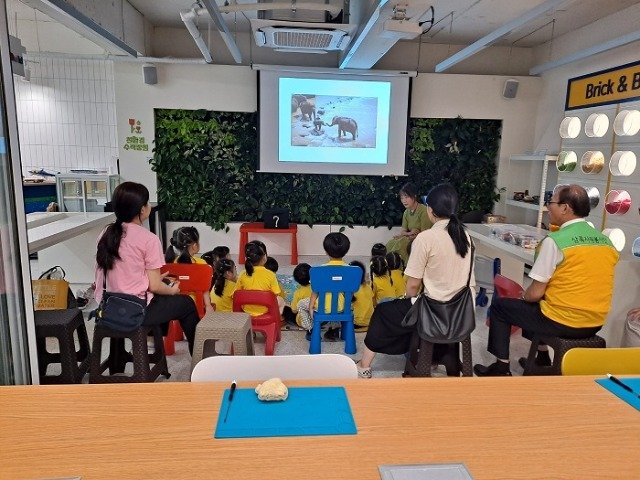 이날 교육은 ‘물에 잠긴 코끼리 마을’이라는 주제로 모형 자동차 등의 장난감을 직접 분류하고 분해하는 눈높이 체험형 방식으로 지구온난화를 예방하는 방법에 대해 아이들이 몸소 느낄 수 있도록 했다.