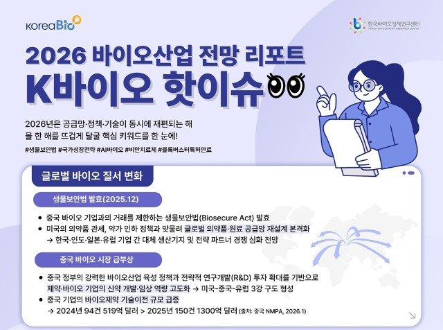 한국바이오협회는 “2026년은 글로벌 경쟁환경 속에서도 K-바이오가 기술력과 혁신으로 도약할 새로운 기회가 될 것”이라며 “AI, 정책, 생산 인프라 등 다차원적 혁신이 향후 시장의 핵심 경쟁력이 될 것”이라고 전망했다.