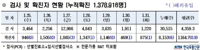 경북도내, 2023년 1월 31일 0시 기준 코로나19 확진자 875명(국내 874, 국외 1) 발생