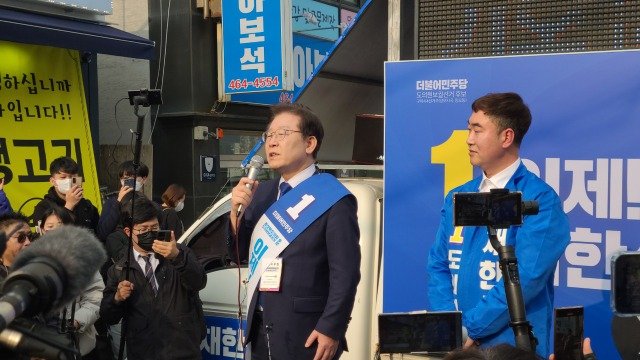(전국= KTN) 김도형 기자= 더불어민주당 이재명 당대표가 구미 제4선거구 경북도의원에 출마한 채한성 후보를 지원하기 위해 28일 구미를 방문했다.