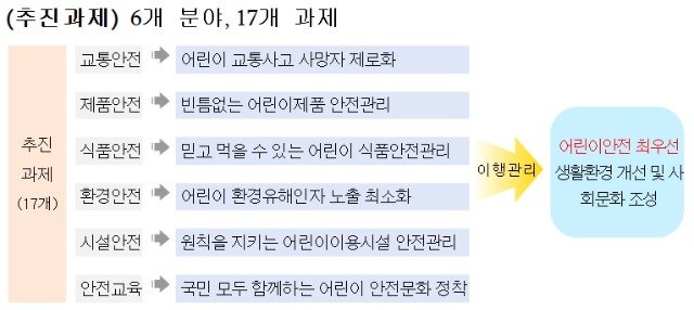 시행계획은 ‘어린이안전 최우선 생활환경 개선 및 사회문화 조성’을 목표로 ▴교통안전 ▴제품안전 ▴식품안전 ▴환경안전 ▴시설안전 ▴안전교육 6개 분야별 추진계획을 담았다.
