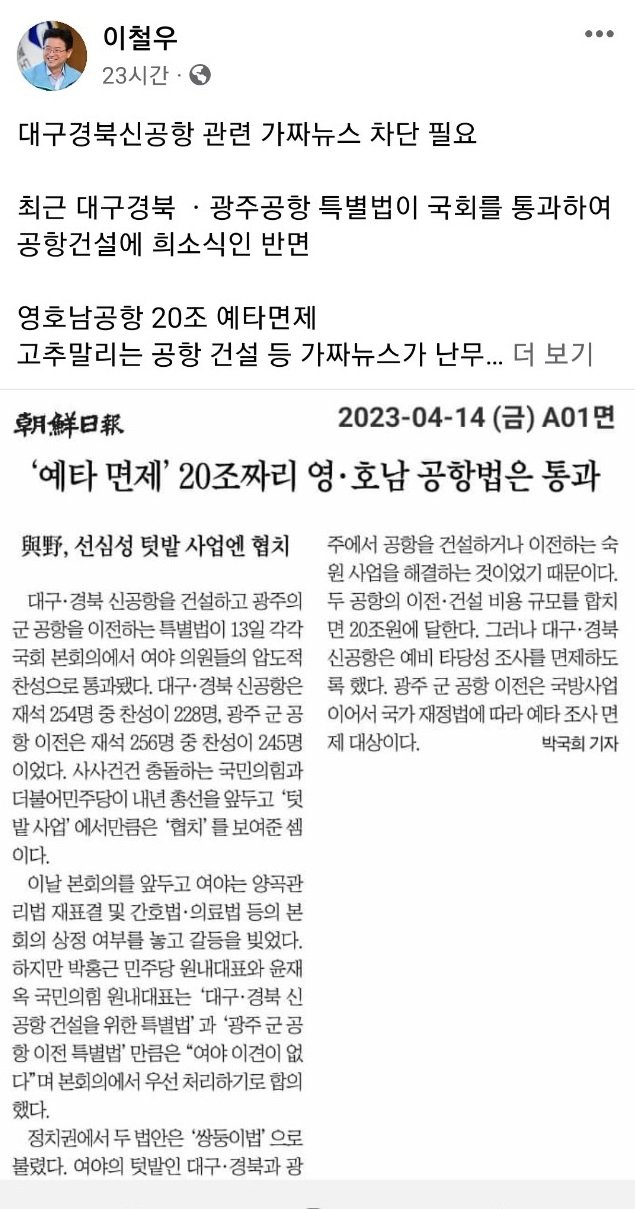 또 “대구경북신공항은 군공항 이전법에 의해 이전하는 공항으로, 지방공항에서 고추 말리는 사진 이야기로 국민에게 가짜뉴스를 전달하고 현혹시키면 안 된다. 도심 속의 소음 때문에 이전하는 군사공항은 원래 예타가 필요 없는 기부 대 양여 방식으로 이전하도록 제도화되어 있다”고 밝히며,