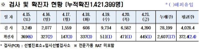 경북도내, 4월 21일 0시 기준 코로나19 확진자 445명(국내 444, 국외 1) 발생