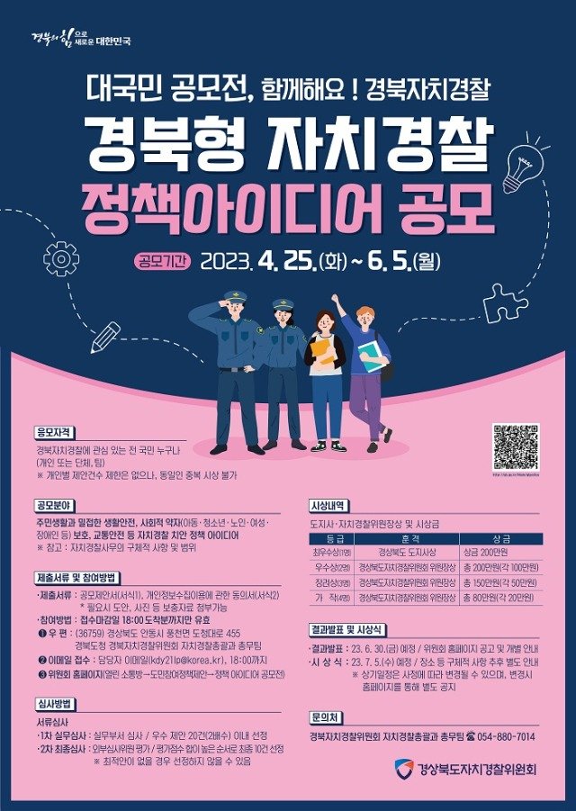 먼저, 4월 25일부터 6월 5일까지 《대국민공모전, 함께해요! 경북자치경찰》을 주제로 「경북형 자치경찰 정책아이디어 공모전」을 연다.