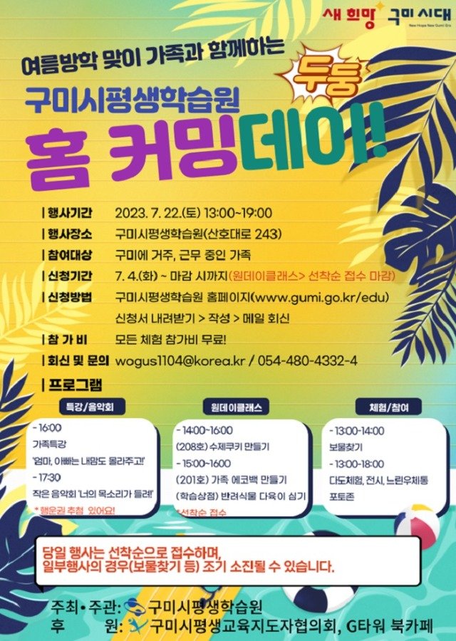(전국= KTN) 김도형 기자= 구미시는 22일 평생학습원에서 여름방학을 맞이해 가족과 함께 하는 ‘평생학습 홈커밍데이’ 행사를 개최한다.