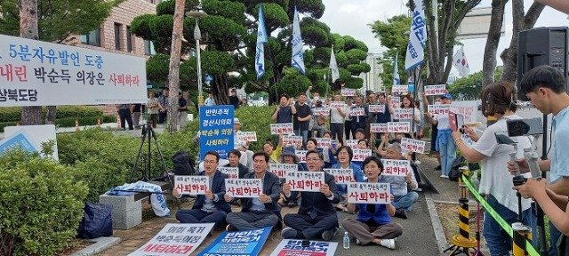 더불어민주당 경북도당은 경산시청 앞 천막농성장에서 열린 이날 결의대회에서 경북도당 주요 당직자들과 시도의원 및 당원, 시민 등 50여명은 박순득 의장의 공식사과와 의장직 사퇴, 재발방지대책을 강력히 촉구하고 경산시의회의 독재와 폭거를 규탄했다고 밝혔다.