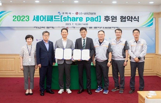 (전국= KTN) 김도형 기자= 구미시는 12일 국제통상협력실에서 따뜻한 나눔문화 선도를 위해 LG유니참(주)(대표이사 김성원)과 「2023 세어 패드(share pad)」 후원 협약식을 열었다.