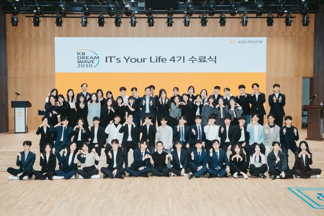 12일 서울 여의도 KB국민은행 신관에서 열린 ‘KB DREAM WAVE 2030 IT’s Your Life’ 4기 수료식 참석자들이 기념 촬영을 하고 있다