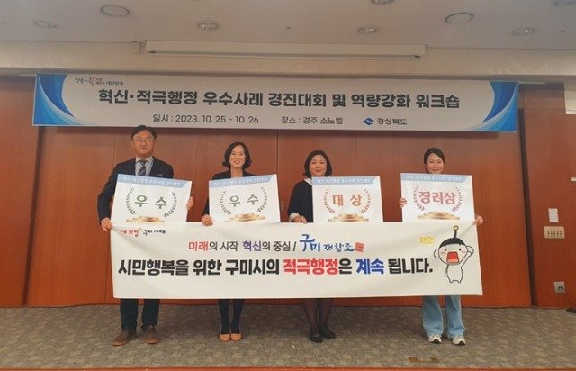 (전국= KTN) 김도형 기자= 구미시는 25일 경주에서 진행된 「2023년 경상북도 혁신 및 적극 행정 우수사례 경진대회」에서 적극 행정 분야 ‘대상’, ‘우수상’, 혁신 분야 ‘우수상’, ‘장려상’을 받았다.