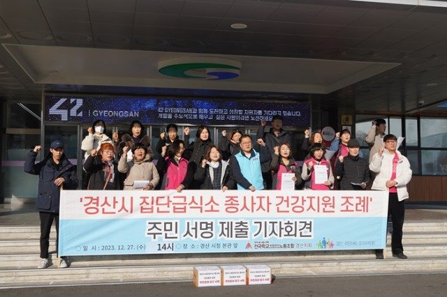 (전국= KTN) 김도형 기자= 경산 주민대회 조직위원회(공동대표 : 남수정, 최광용, 박정애, 정진구)와 전국학교비정규직노동조합 경산지회(대표 : 조난희)(이하, 조직위와 노동조합)은 2023년 12월 27일 (수) 오후 2시 경산시청 본관 앞에서 ‘경산시 집단급식소 종사자 건강증진 조례’ 주민 서명 제출 기자회견을 진행하고 경산시의회에 주민 서명을 제출 했다.