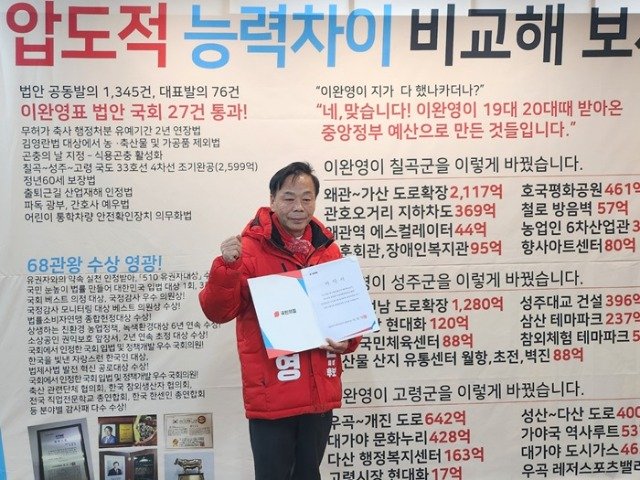 앞서 이완영 예비후보는 지난 19일 예비후보로 등록하고 본격 선거운동에 나섰다.