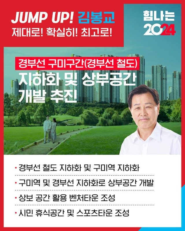 한편으로 김봉교 예비후보는 구미 경부선 철도 지하화 및 구미역사가 지하화 될 경우 상부공간은 벤처타운 조성(소규모 청년창업 거리 조성) 및 시민휴식공간 및 스포츠타운 조성 등 명품거리 조성을 통하여 구미시의 경쟁력 확보가 필요한 시점이라고 강조하였다.