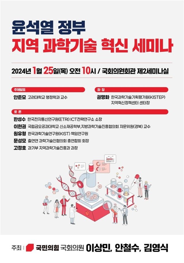 (전국= KTN) 김도형 기자= 구미을 김영식 의원과 이상민 의원(대전 유성구을, 국민의힘), 안철수 의원(경기 성남시분당구갑)이 공동주최하는 ‘윤석열 정부, 지역 과학기술 혁신’ 세미나가 오는 25일(목) 오전 10시 국회의원회관 제2세미나실에서 개최된다.