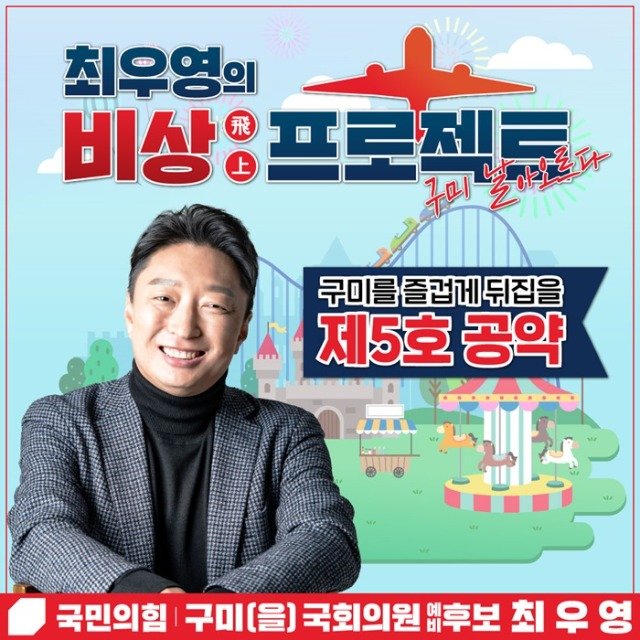 최우영 예비후보는 이날 5호 공약 발표에서 △메이플스토리 리얼월드 유치(대형놀이공원) △구미 키즈과학관 설립 △선산곱창․선산막걸리 등 지역 특화 먹거리 골목 조성 및 브랜드화 △관광택시 도입 등을 통해 “구미를 동남권 문화관광 1번지로 도약시키겠다”고 밝혔다.