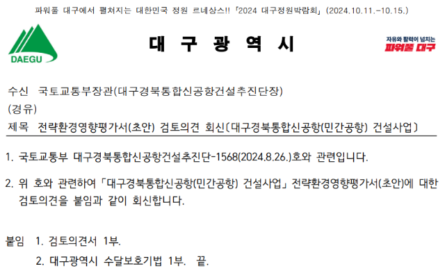 (전국= KTN) 김도형 기자= 대구시는 지난 9월 13일 국토교통부장관에게 '대구경북통합신공항(민간공항) 건설사업 전략환경영향평가서(초안) 검토의견을 회신했다.